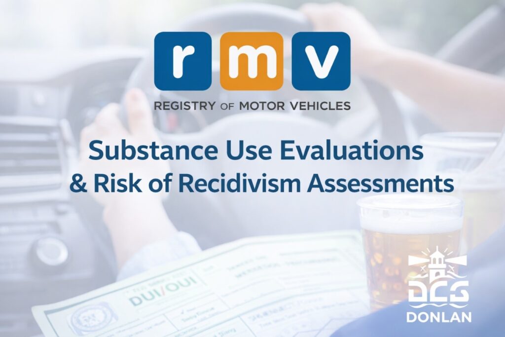 Substance Use Evaluations and Risk of Recidivism Assessments, commonly referred to as drug and alcohol evaluations, DUI assessments, or RMV evaluations, are structured clinical assessments frequently required in Massachusetts OUI/DUI and Immediate Threat cases. These evaluations assess an individual’s current and past substance use, the impact of substance use on driving safety, relevant medical and mental health history, and factors associated with the risk of reoffending. The evaluation process includes a comprehensive clinical interview and the use of standardized assessment instruments consistent with DSM criteria and accepted professional guidelines. Appointments are available in person or via secure telehealth and typically last 60 to 90 minutes. Following the evaluation, a written substance use evaluation and, when applicable, a risk of recidivism assessment is completed. These reports summarize clinical findings and provide an evidence-based assessment of risk and recommendations. Completed evaluations are provided directly to the individual, who may submit them to the RMV, court, or other requesting authority as required.